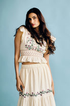 Delicate, feminine, and effortlessly charming, this Athiya in Aster Blouse is designed to make a statement with subtle detailing. Crafted in soft cotton fabric, the blouse features delicate floral embroidery across the yoke, adding an artisanal touch to its romantic silhouette.