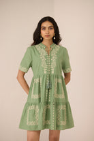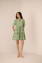 A sophisticated Grace Mini Dress adorned with exquisite symmetrical floral embroidery, bringing an artisanal charm to a timeless silhouette. Delicate neck ties finished with beaded tassels add a refined, elegant touch, while intricate embroidery on the short sleeves enhances its feminine appeal.