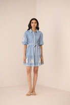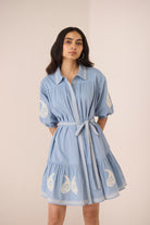Intricately crafted and effortlessly elegant, the Lizzie Mini Dress is a celebration of artisanal detail and relaxed sophistication. Adorned with delicate paisley embroidery, this mini dress is finished with an exquisitely embroidered border along the hem, collar, and concealed button placket, creating a refined yet distinctive look. The contrast cream dori embroidery adds a beautiful handcrafted touch, elevating the overall design.
