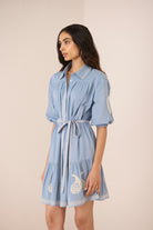 Crafted in soft, breathable cotton and fully lined for comfort, the Lizzie Mini Dress features gently gathered sleeves with elasticated cuffs for ease and movement. A matching embroidered belt allows you to cinch the waist or wear it loose for an effortless, oversized silhouette—perfect for warm days when comfort meets style.