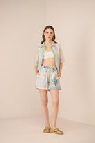 A unique contrasting border highlights the hem, lending a polished and decorative finish to the design. The elasticated waistband ensures all-day ease, while adjustable drawstrings adorned with delicate bead detailing add a subtle artisanal touch. Easy, breezy, and chic, these shorts are perfect for warm days and relaxed yet elevated styling.