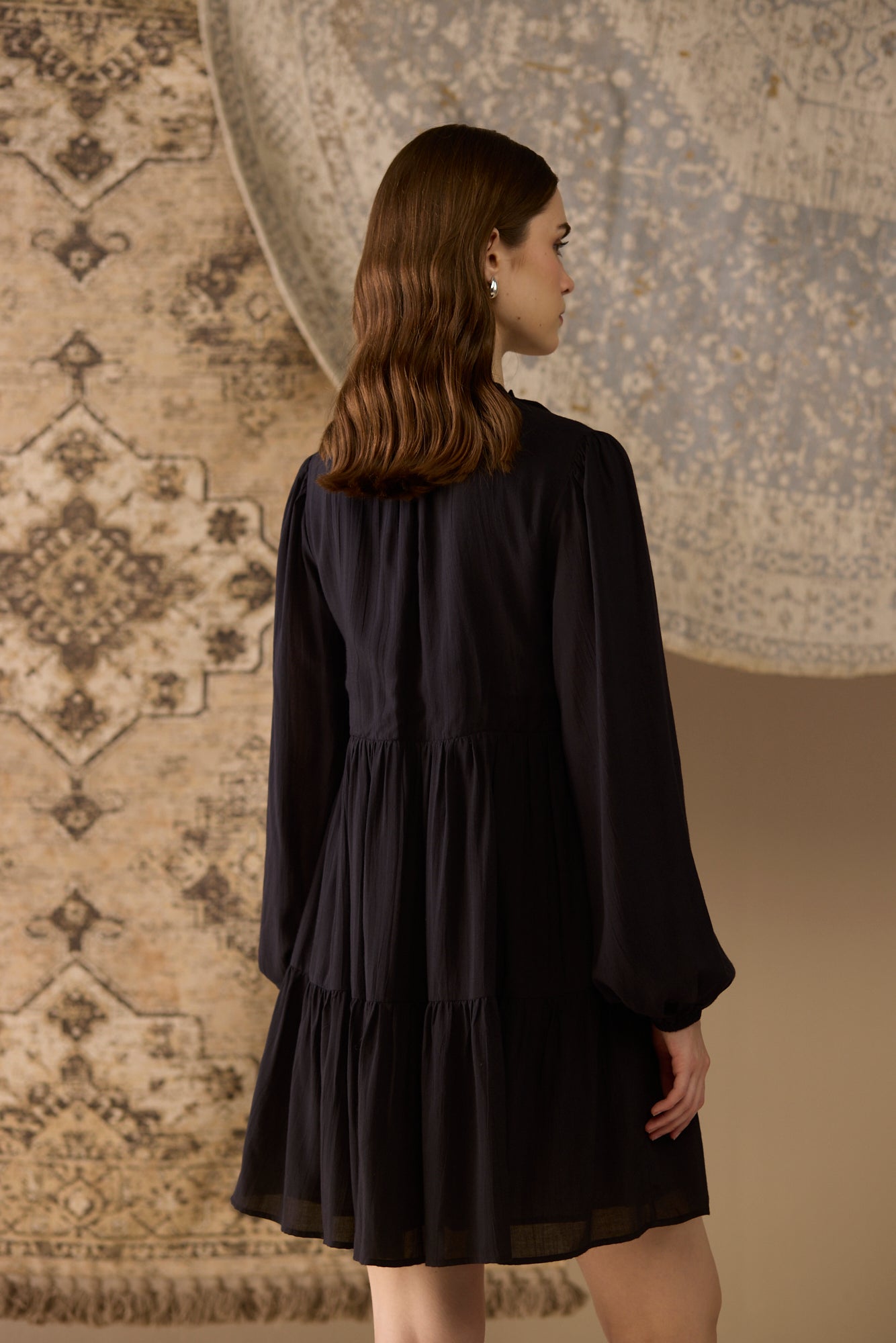 Timeless and versatile, the Ray Mini Dress in solid black is a wardrobe essential. Crafted in soft buttery modal fabric, its clean A-line silhouette flows effortlessly, making it perfect for both day and night. The functional placket to the high waist and long sleeves with elasticated cuffs add subtle detailing, while the oversized fit makes it easy to layer. Fully lined for comfort and elegance, this dress is a chic staple you’ll reach for again and again.