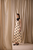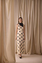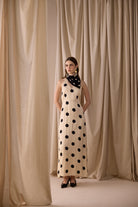 Reimagined in a playful yet classic white and black polka dot print, this fitted maxi blends sophistication with charm—perfect for chic soirées or daytime elegance.