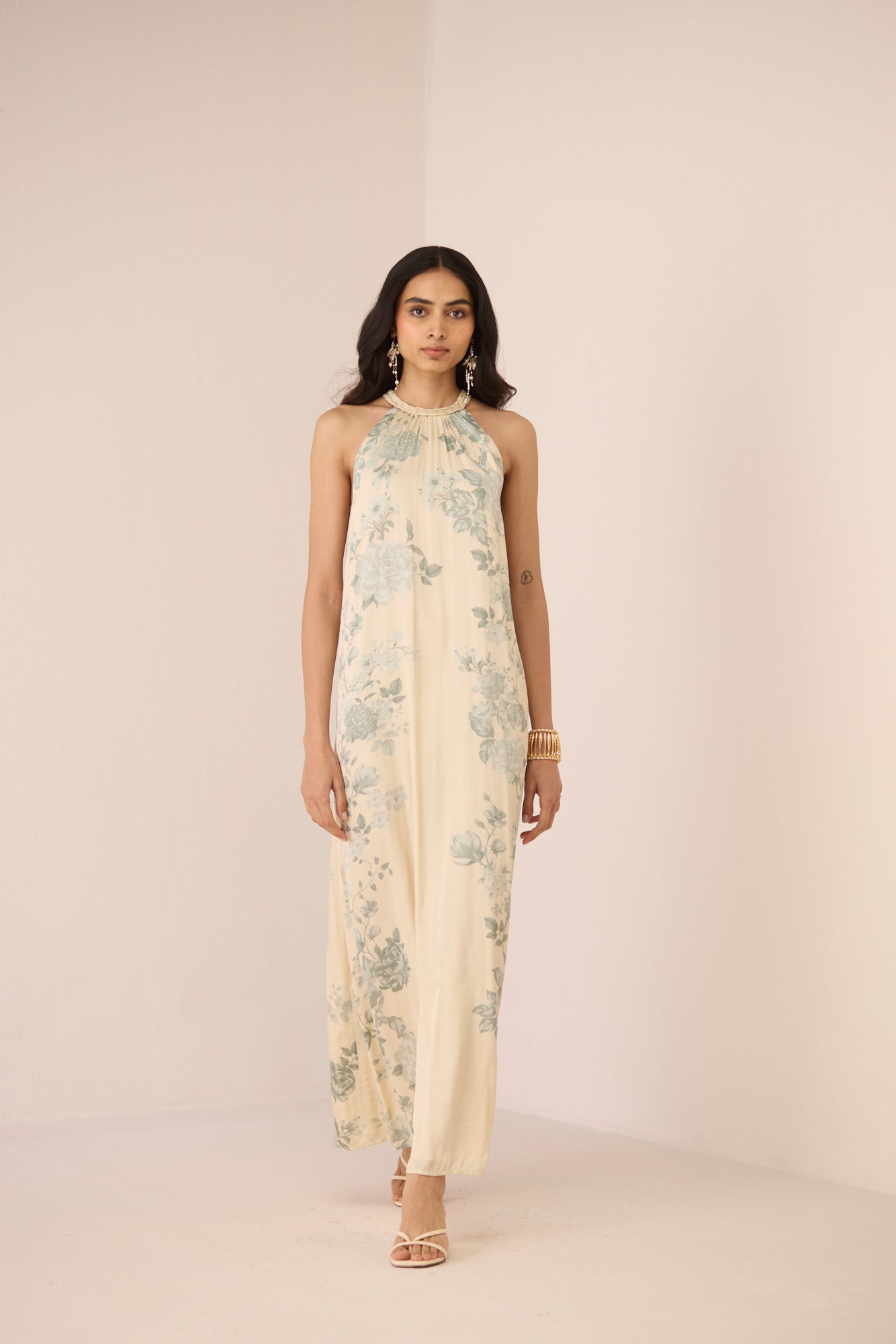 The braided halter neckline elevates the design, opening into an adjustable tie at the back for comfort and ease. Fully lined and gently A-line, this maxi dress offers an oversized, free-flowing fit that feels light, flattering, and relaxed. Thoughtfully designed to be pregnancy-friendly, it’s perfect for warm days, holidays, and effortless evening elegance.