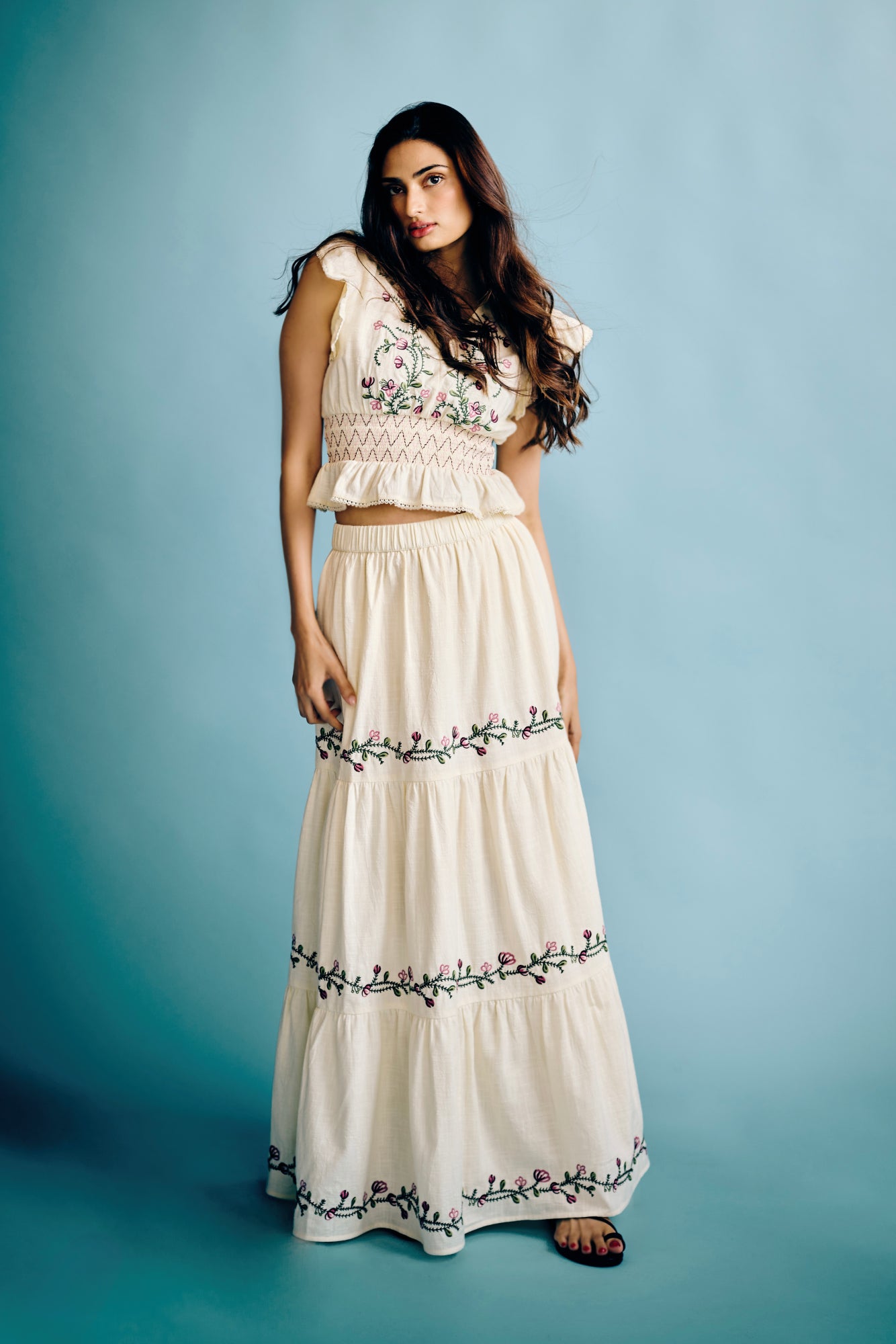 Graceful and effortlessly feminine, the Athiya Shetty in Aster Skirt that is designed to move beautifully with every step. Crafted in soft cotton fabric, this flowing maxi-length skirt features delicate floral embroidery that adds a timeless, romantic charm to its tiered silhouette.