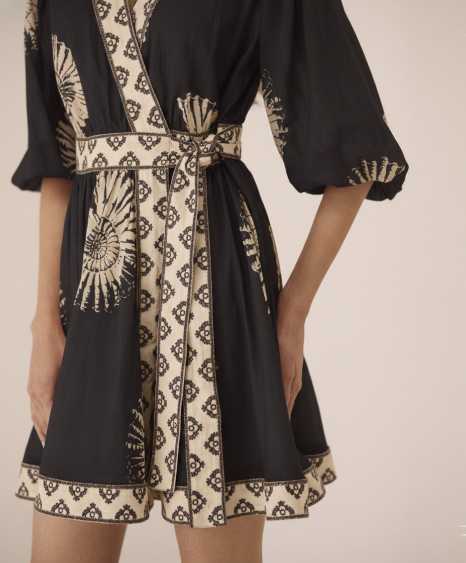 Chic and effortlessly feminine, the Marlin Mini Dress is a wrap-around silhouette designed to flatter and define with ease. Crafted in a lightweight cotton fabric that feels like second skin, this mini dress is perfect for warm summer days. The playful sea shell print adds a breezy, vacation-ready charm, while thoughtfully placed embroidery along the hem and belt lends an artisanal, elevated touch.