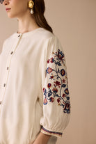 Timeless and refined, the Olivia blouse blends elegance with everyday ease. Detailed with coconut shell buttons and floral embroidery on the sleeves, it’s a versatile piece that can be styled solo or layered for a polished, modern look.