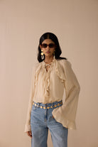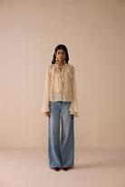 Bold yet feminine, this ivory blouse is designed to make a statement with its dramatic neck ties and oversized sleeves. Crafted in luxe lurex chiffon, it shimmers softly while the frills and gathers add texture and volume—perfect for elevating your wardrobe with a touch of glamour.