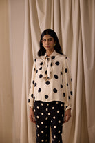 Timeless with a playful twist, the Elegance Blouse is reimagined in a soft buttery modal fabric with a classic white and black polka dot print. Designed with a chic tie-neck feature, it adds instant sophistication while the oversized silhouette keeps it effortlessly modern. Lightweight and versatile, this blouse is the perfect balance of polished and playful. Best paired with our Glam Trouser and matching scarf for a coordinated statement look.
