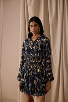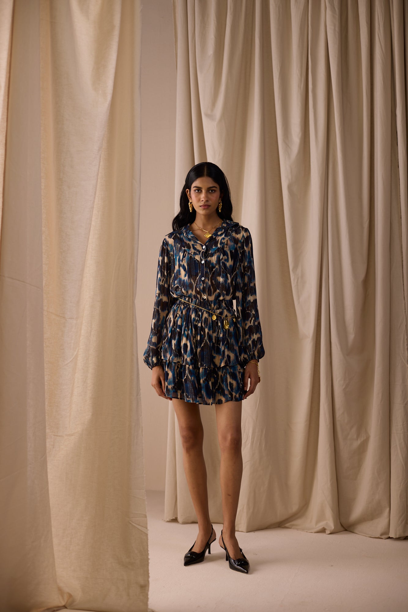The Peach Mini Skirt is a playful, tiered silhouette crafted in viscose georgette with a blue-hued abstract print and vertical lurex lines that add the perfect touch of glam. Fully lined for comfort, it’s designed with an all-round elasticated waistband for ease, movement, and effortless styling. Flowing and flirty, this versatile mini pairs perfectly with the matching Carter Shirt or styled solo for a chic statement.
