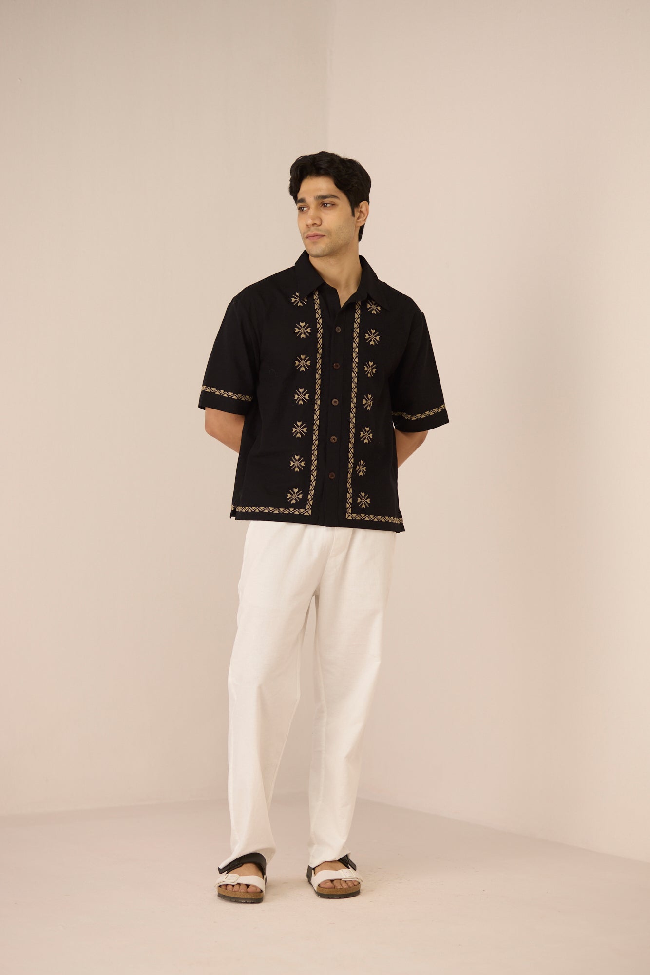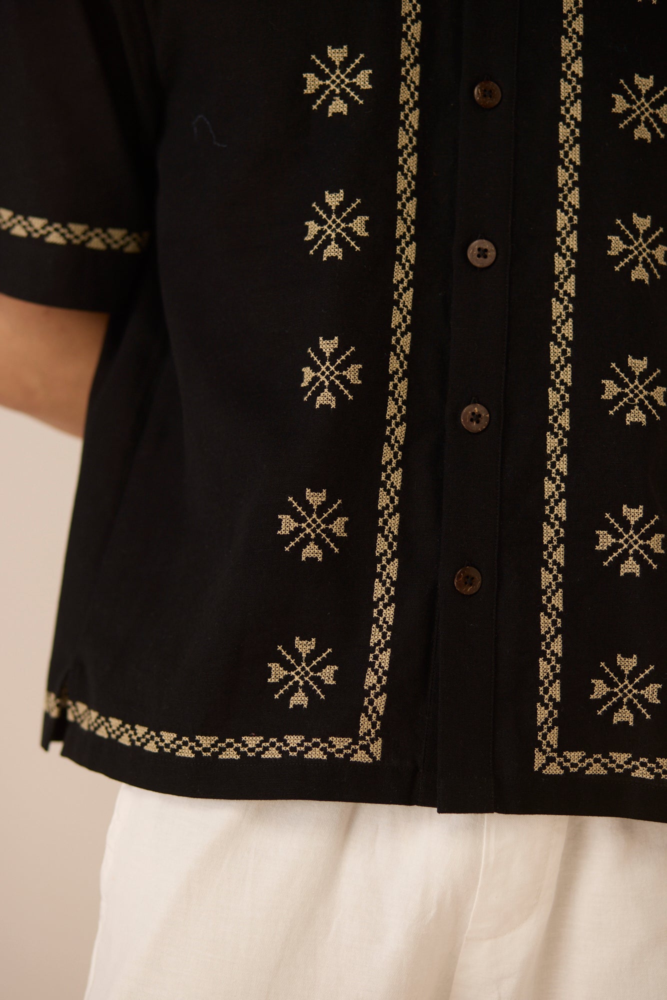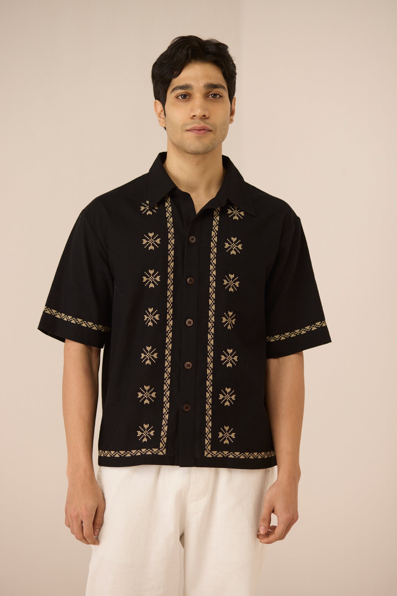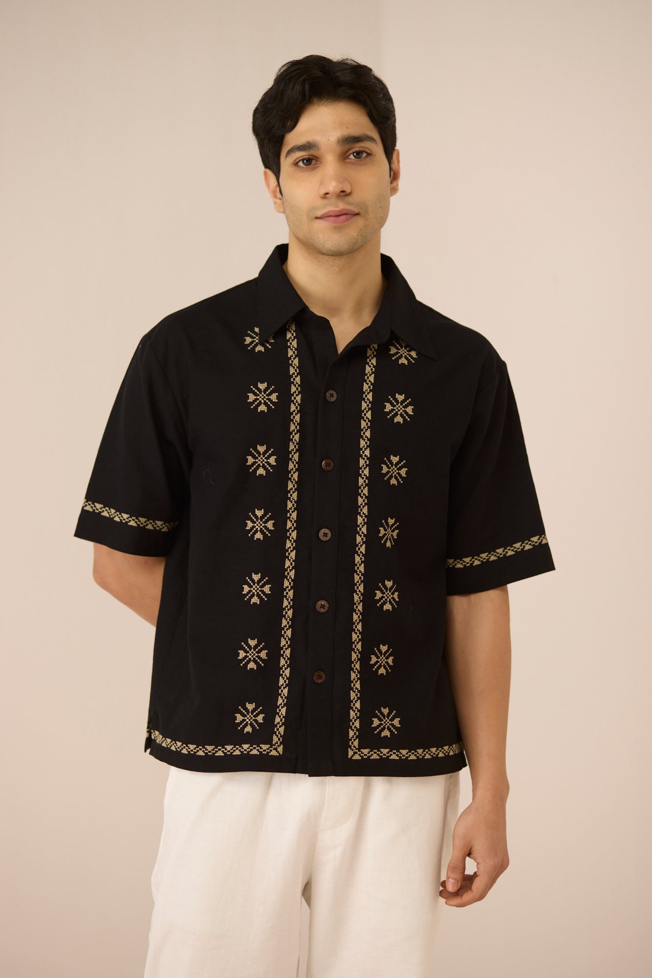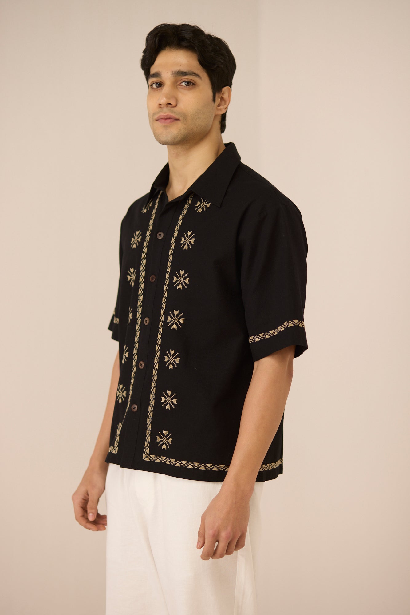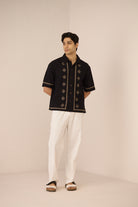 Timeless with a refined edge, this black short-sleeve shirt is accented with subtle embroidered motifs and delicate contrast detailing along the placket, sleeves, and hem. Designed with a relaxed silhouette and classic collar, it offers an elevated yet effortless approach to everyday dressing. Crafted in a soft, breathable cotton linen fabric, it feels lightweight and comfortable from day to night.