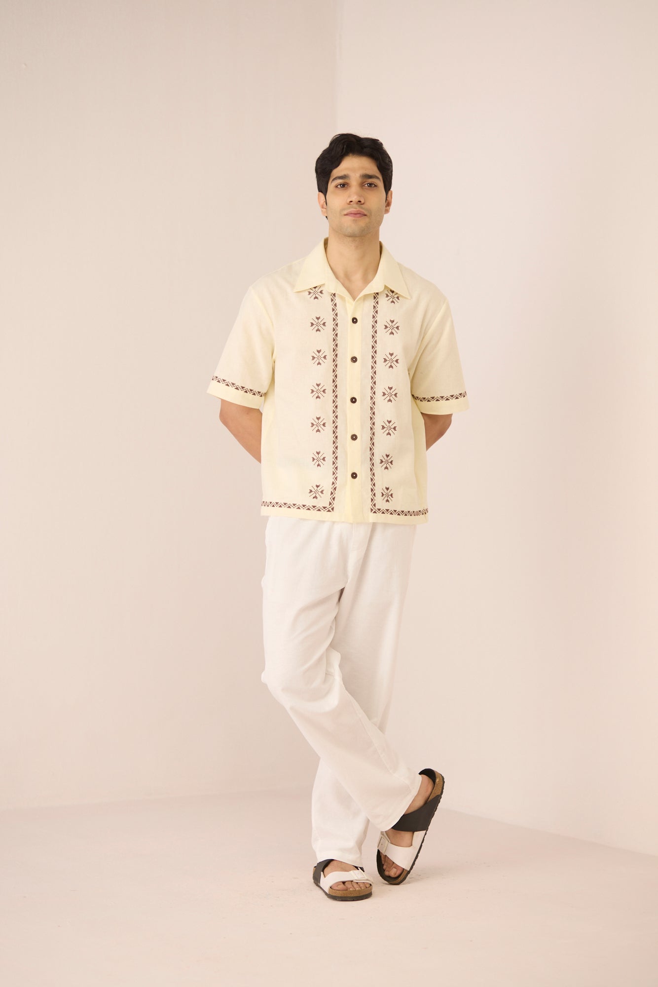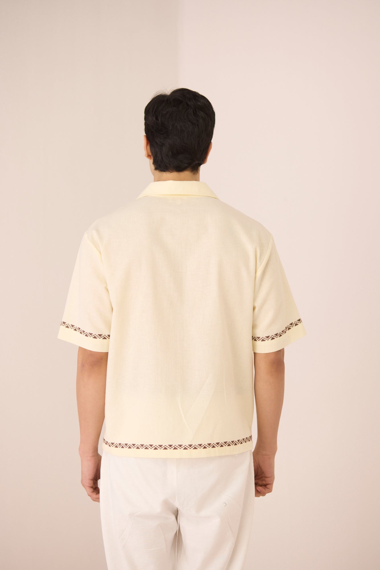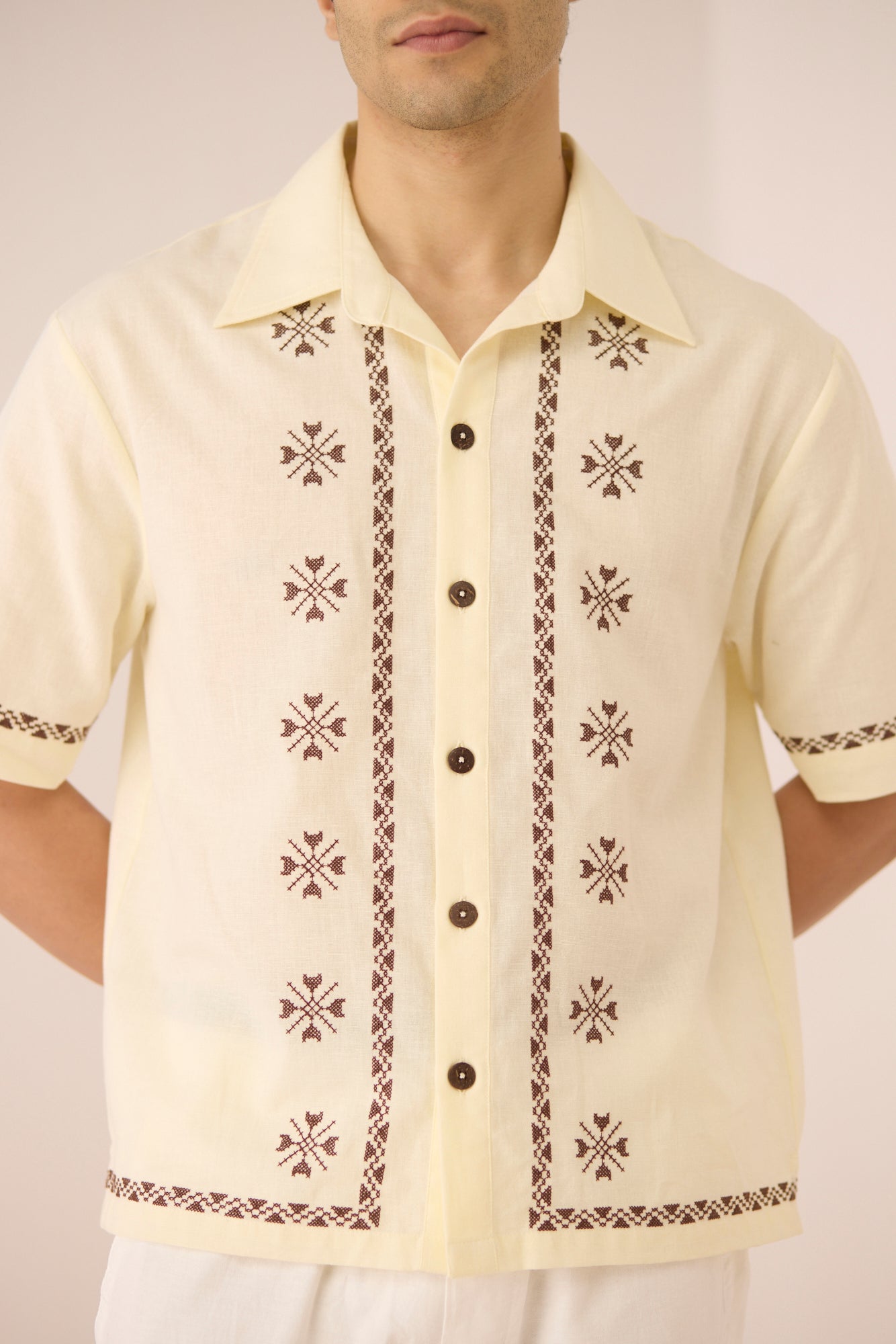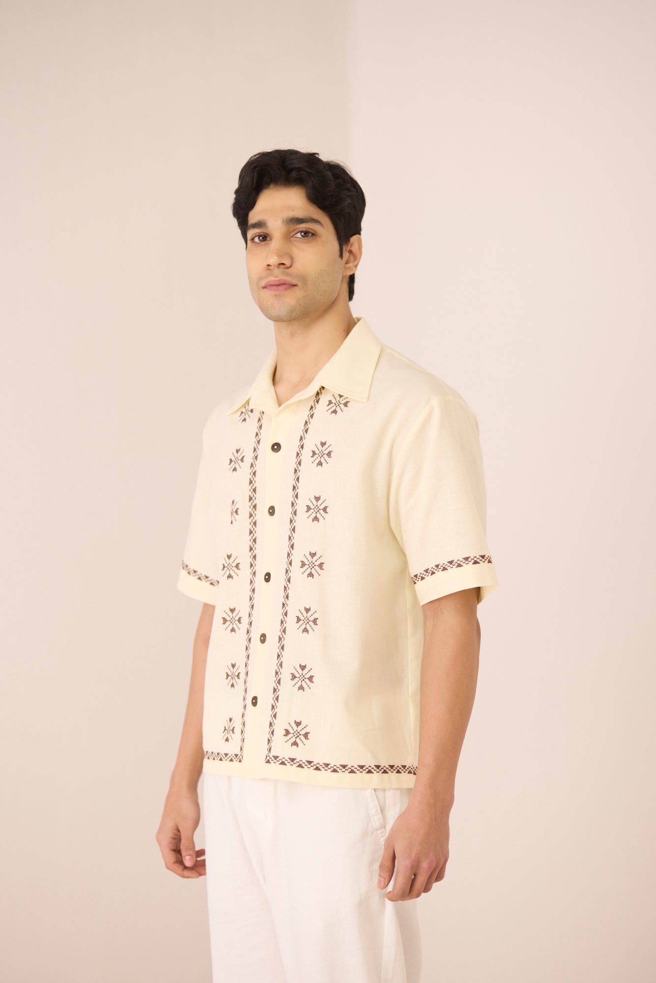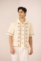 Timeless with a refined edge, this ivory short-sleeve shirt is accented with subtle embroidered motifs and delicate contrast detailing along the placket, sleeves, and hem. Designed with a relaxed silhouette and classic collar, it offers an elevated yet effortless approach to everyday dressing. Crafted in a soft, breathable cotton linen fabric, it feels lightweight and comfortable from day to night.