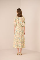 Romantic and effortlessly elegant, the Rosewood Midi Dress is designed to flatter with timeless femininity. Featuring a graceful V neckline and a fitted waist, the silhouette flows into a soft, airy skirt that moves beautifully with every step. Delicate elasticated sleeves with a subtle puff add a touch of charm, while the botanical print lends itself perfectly to sundowner soirees and special occasions.