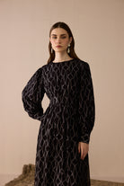 A sophisticated black jacquard maxi dress designed to turn heads with its elegant backless silhouette. The dress features a button closure at the back neck for ease of wear, along with a fitted waist that creates a flattering shape. A delicate tie detail at the lower back can be styled into a charming bow, adding a feminine touch. Crafted in luxurious viscose georgette with a geometric jacquard weave, it balances subtle glam with timeless elegance.