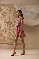 Romantic and playful, the Layla Mini Dress comes alive in a pink hue print adorned with gold jacquard dots for a subtle touch of glam. Crafted in lightweight viscose georgette and fully lined, it features a flattering V neckline, dropped shoulders for a relaxed fit, and elasticated cuffs for volume. The matching fabric belt cinches the waist to enhance the silhouette, making it perfect for both day-to-night dressing.