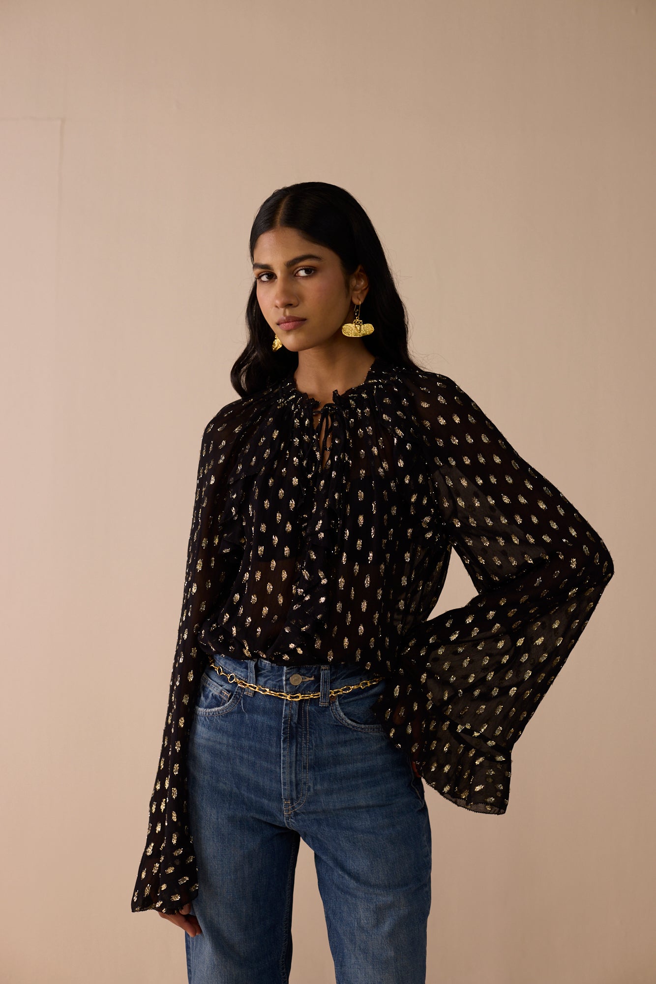 Bold and feminine, the Limelight Blouse in black makes a statement with its dramatic neck ties and oversized sleeves. Designed with frills and gatherings along the shoulders and front, it creates a beautifully textured, voluminous silhouette. Crafted in viscose georgette with gold jacquard dots, it brings just the right touch of glam—perfect for evenings that call for effortless sophistication.