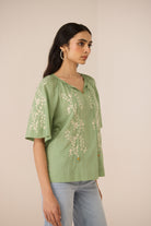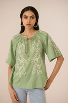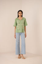 Graceful and effortlessly feminine, the Melon Blouse features delicate vine embroidery across the front and sleeves, lending a soft, elegant charm to its timeless silhouette.