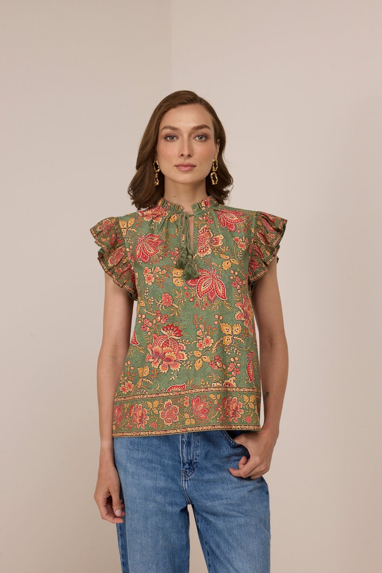 Feminine and easy to wear, the Madison Blouse is adorned with frill cap sleeves and soft neck ties—finished in the romantic Marika Floral Print for a touch of everyday charm.