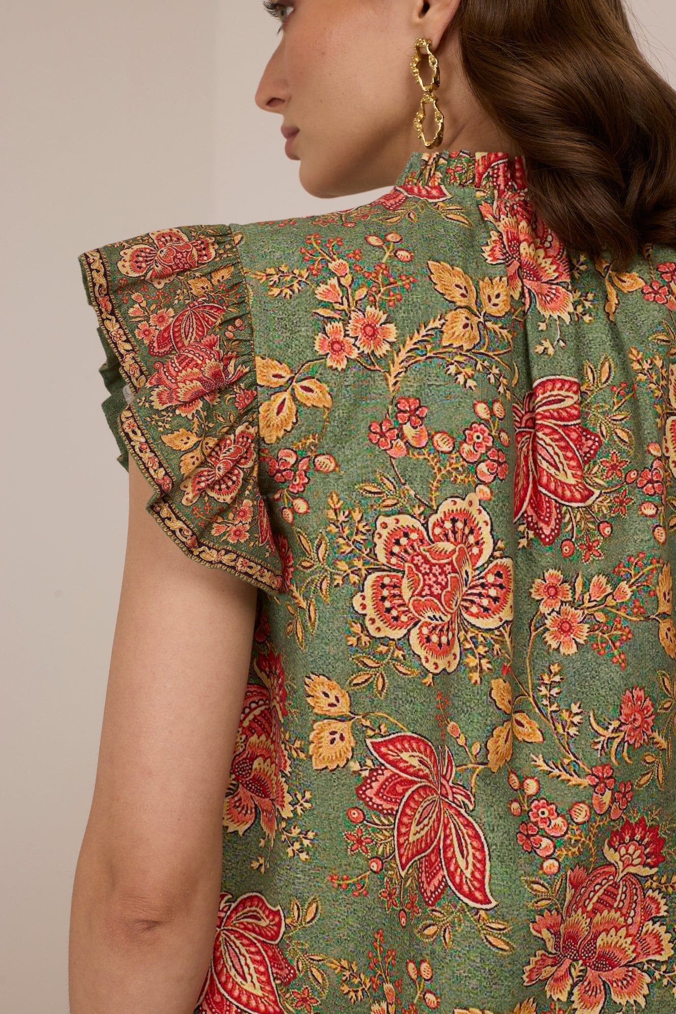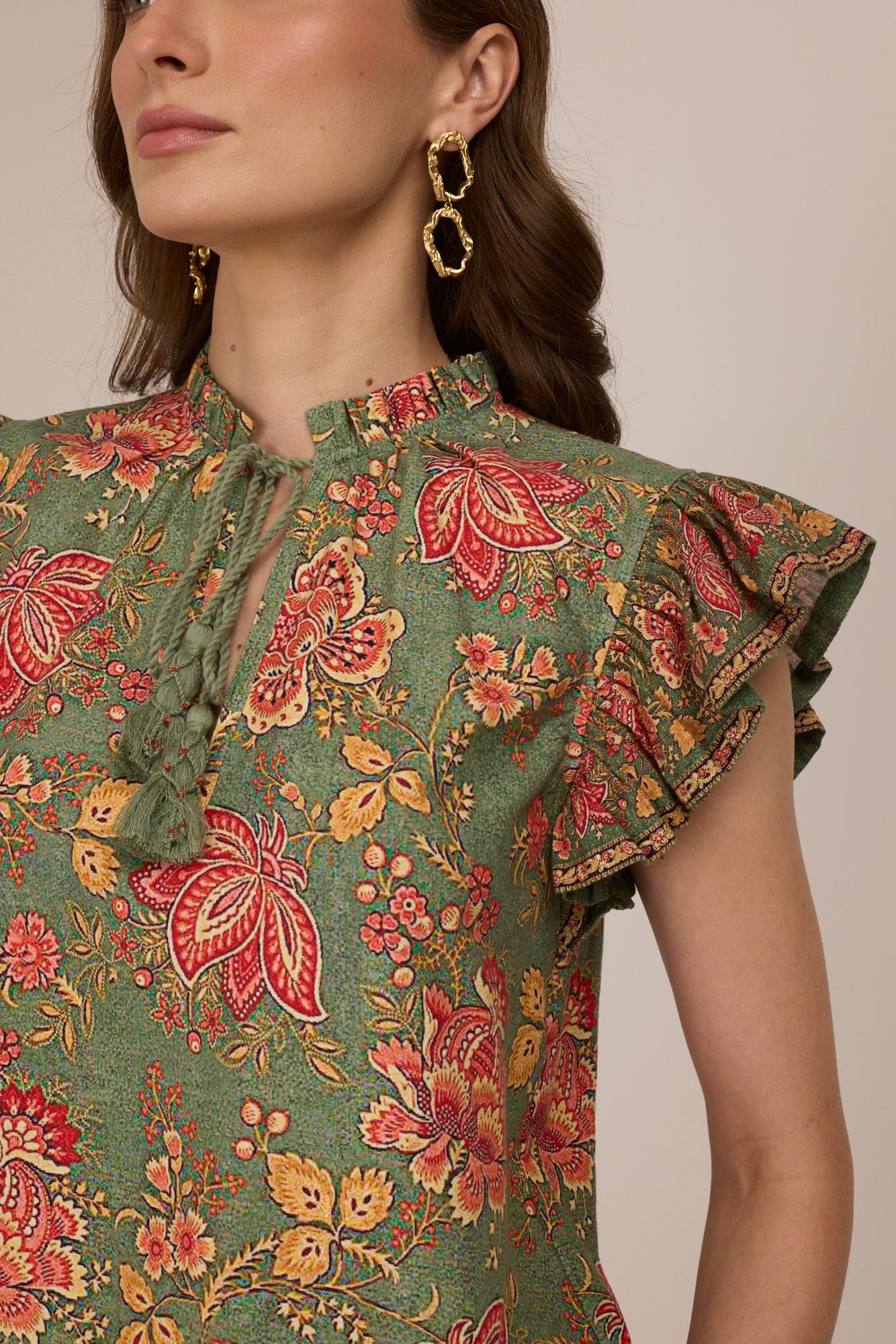• Features the delicate Marika Floral Print in soft, botanical tones