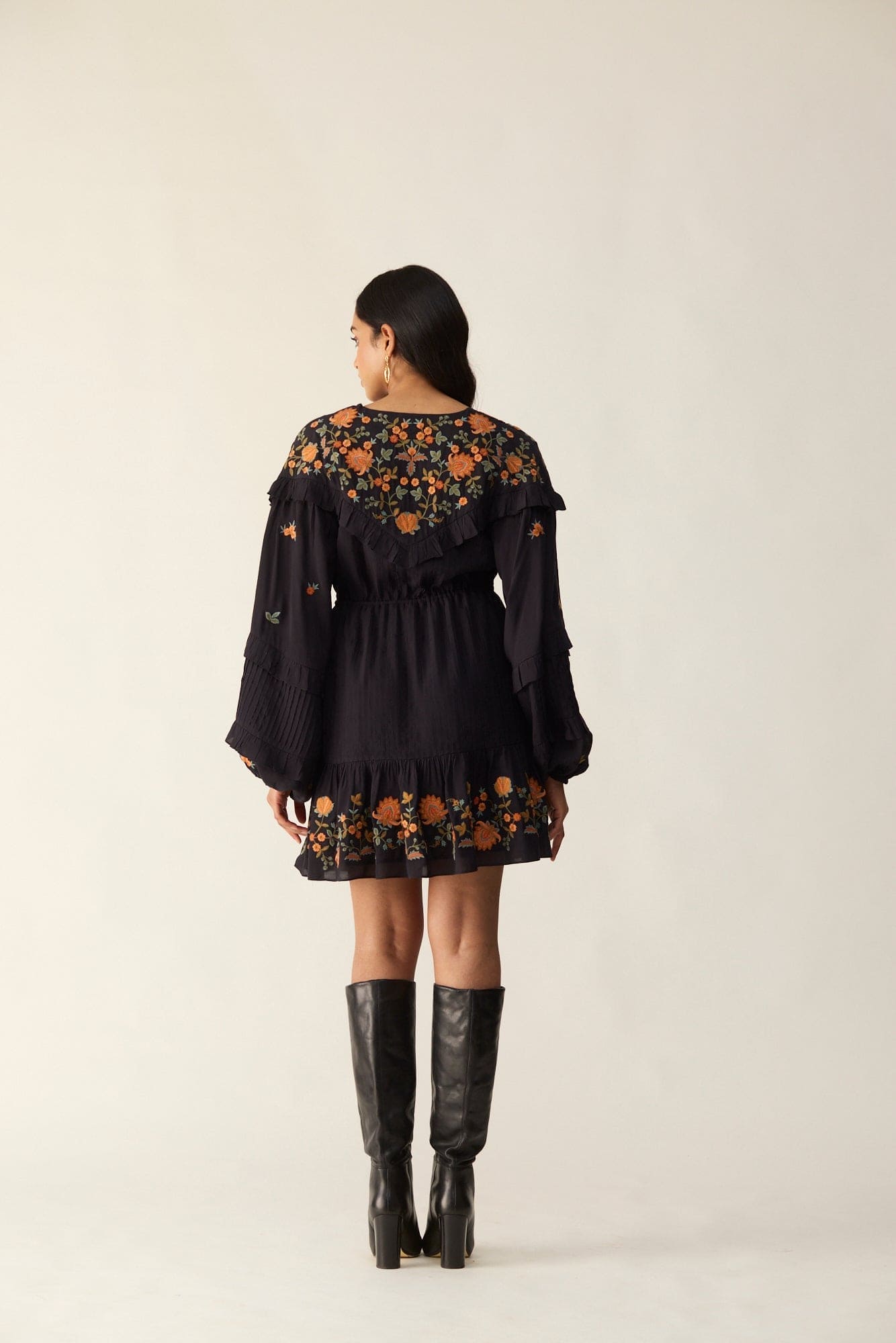 Noir Mini dress features exquisite floral embroidery on both the yoke and bottom, creating a delightful contrast. The addition of a dori on the waist adds a touch of elegance while allowing you to customize the fit.