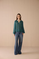 Elegant and timeless, this serene sea-green blouse is designed to exude sophistication with a hint of shimmer. Crafted in viscose georgette with vertical lurex lines, it’s a versatile piece that transitions seamlessly from workdays to evenings out.