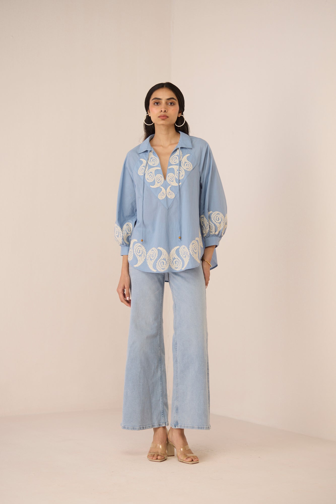 Designed with a classic collar and a soft neck tie finished with beaded ends, this blouse carries subtle statement elements while remaining timeless. Crafted in lightweight cotton, it feels breathable and airy, making it ideal for all-day wear. The oversized silhouette enhances its relaxed appeal, allowing it to drape beautifully on the body.