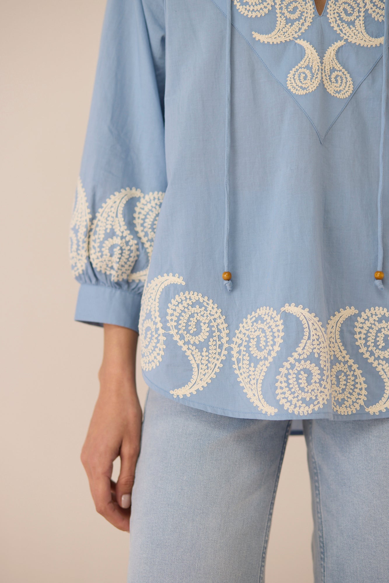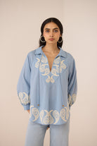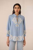 Graceful and effortlessly refined, the Remi Blouse is adorned with delicate paisley dori embroidery that brings an artisanal, handcrafted charm to the silhouette. Thoughtfully detailed yet easy to wear, it strikes the perfect balance between elegance and everyday versatility.