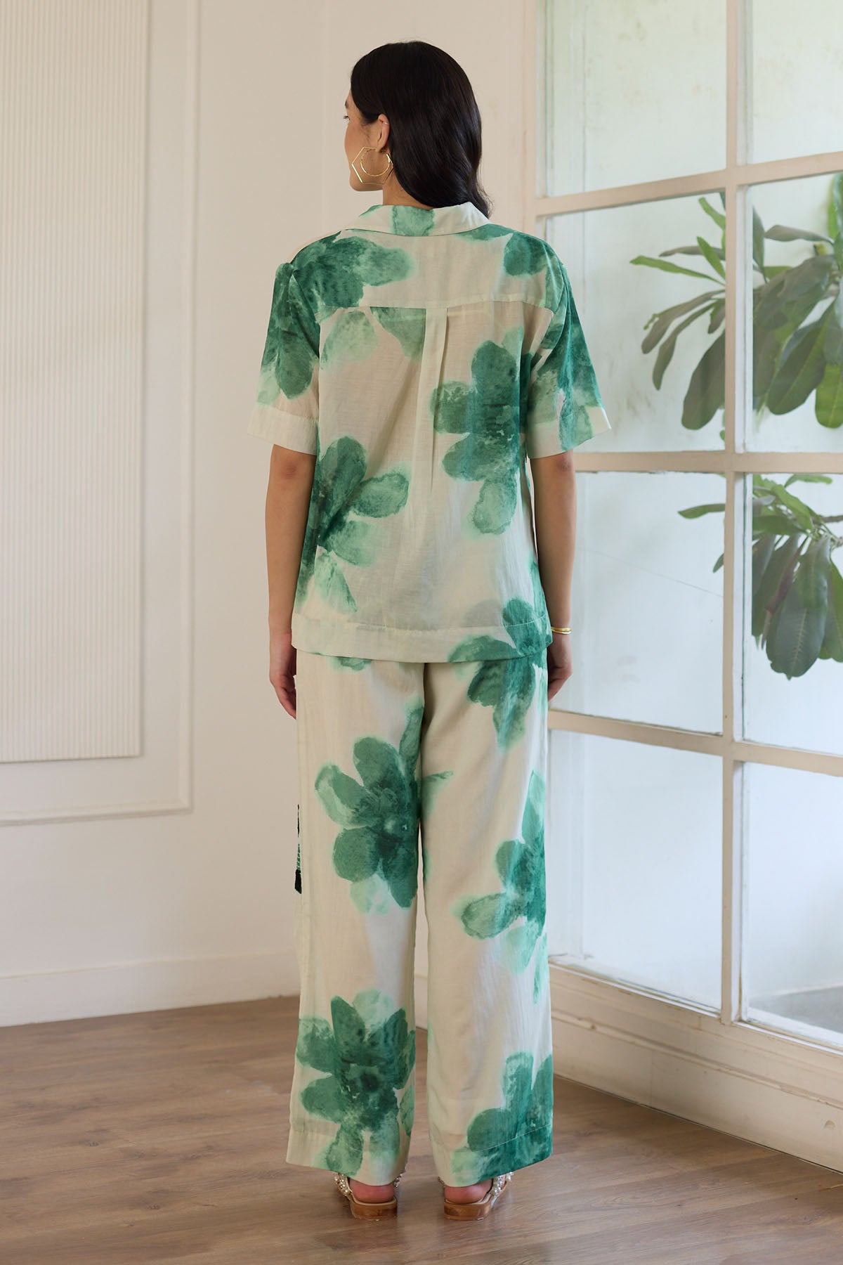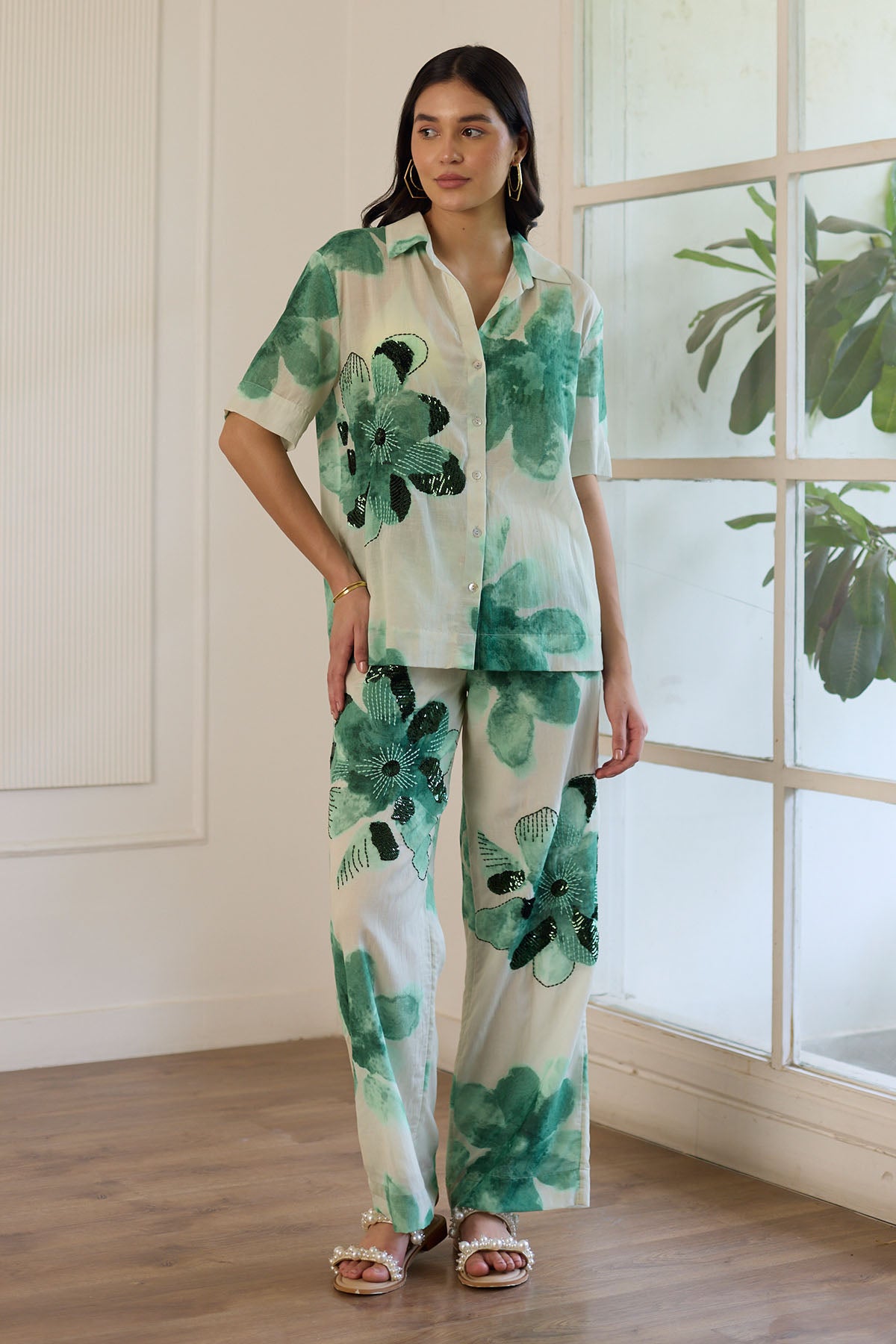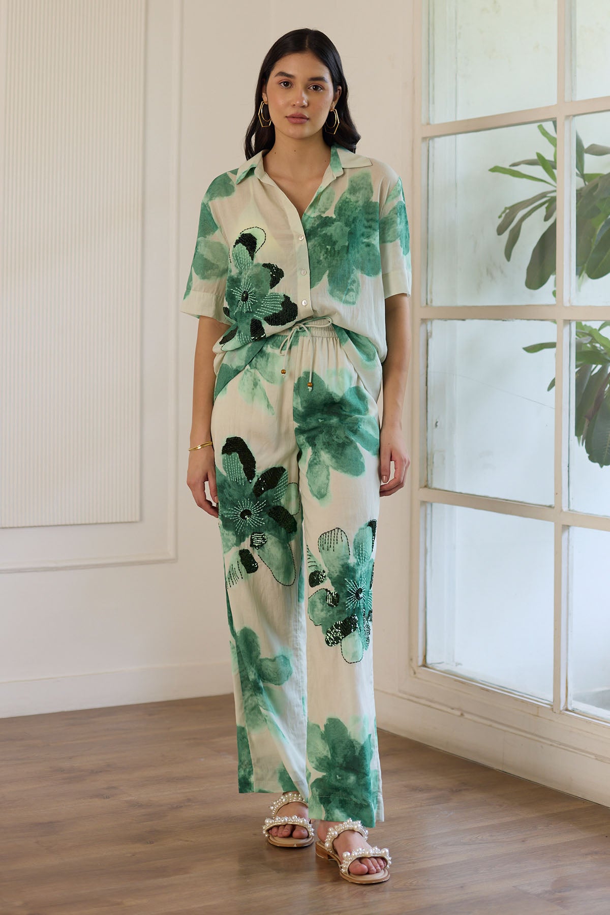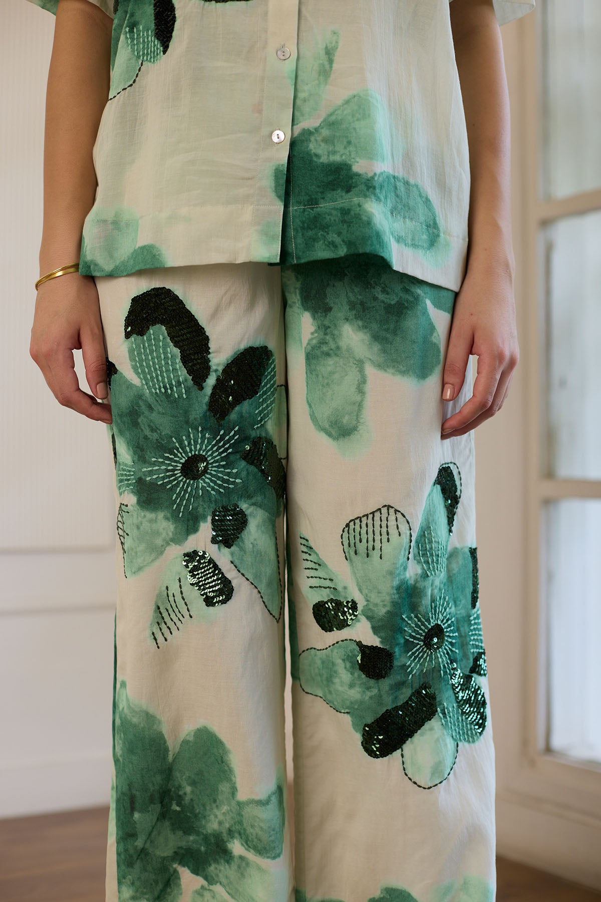 This trouser features an eye-catching print of green abstract flowers, with select flowers intricately enhanced by hand embroidery for an added touch of sophistication. The trousers feature an elasticated waistband for a comfortable fit.