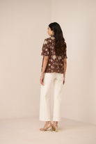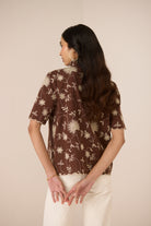 Rich and romantic, this chocolate brown high-neck shirt is adorned with intricate all-over floral dori embroidery, bringing depth and artisanal beauty to its timeless silhouette. Thoughtfully detailed, it features a delicate frill accent along the front and a softly scalloped hem for an elegant, feminine finish.