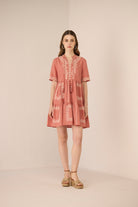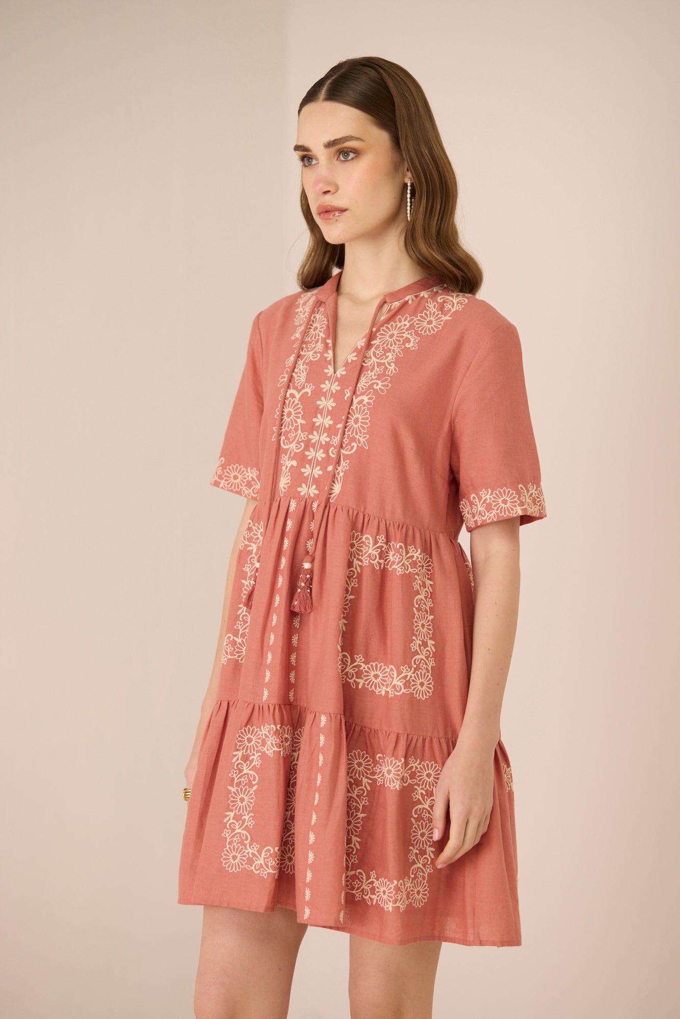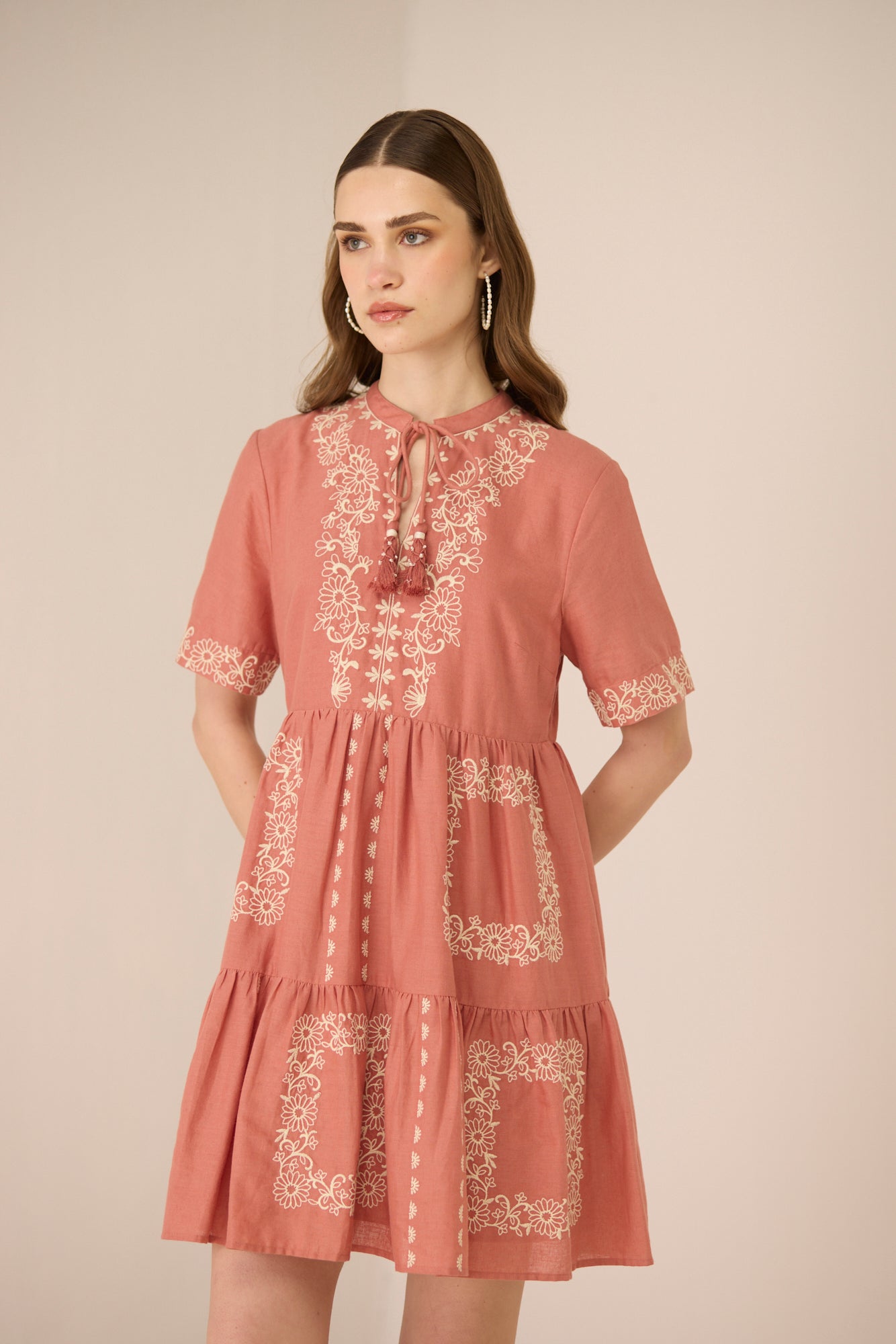 A sophisticated Grace Mini Dress adorned with exquisite symmetrical floral embroidery, bringing an artisanal charm to a timeless silhouette. Delicate neck ties finished with beaded tassels add a refined, elegant touch, while intricate embroidery on the short sleeves enhances its feminine appeal.