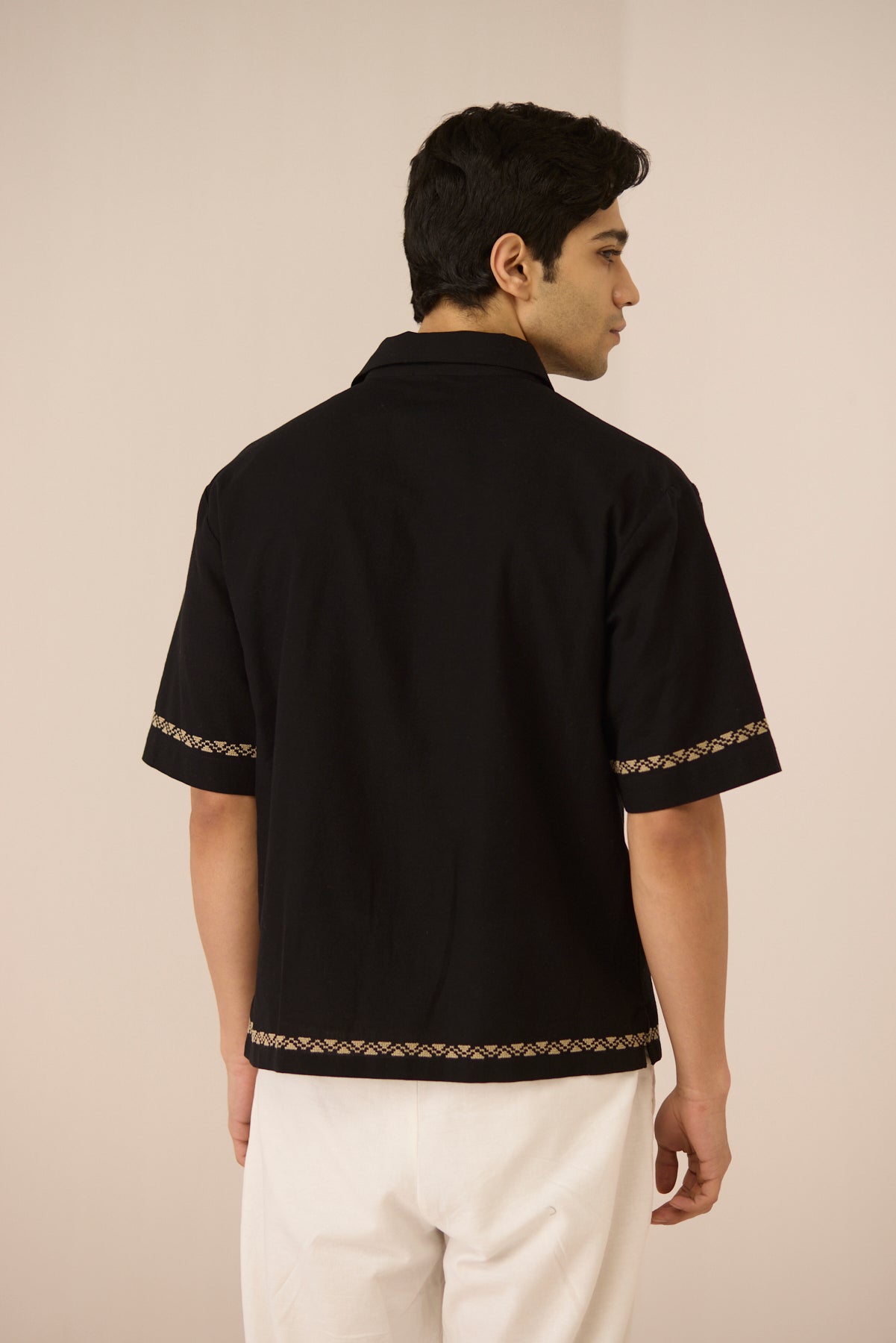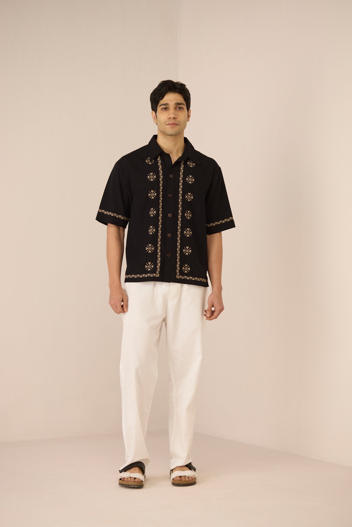 Timeless with a refined edge, this black short-sleeve shirt is accented with subtle embroidered motifs and delicate contrast detailing along the placket, sleeves, and hem. Designed with a relaxed silhouette and classic collar, it offers an elevated yet effortless approach to everyday dressing. Crafted in a soft, breathable cotton linen fabric, it feels lightweight and comfortable from day to night.