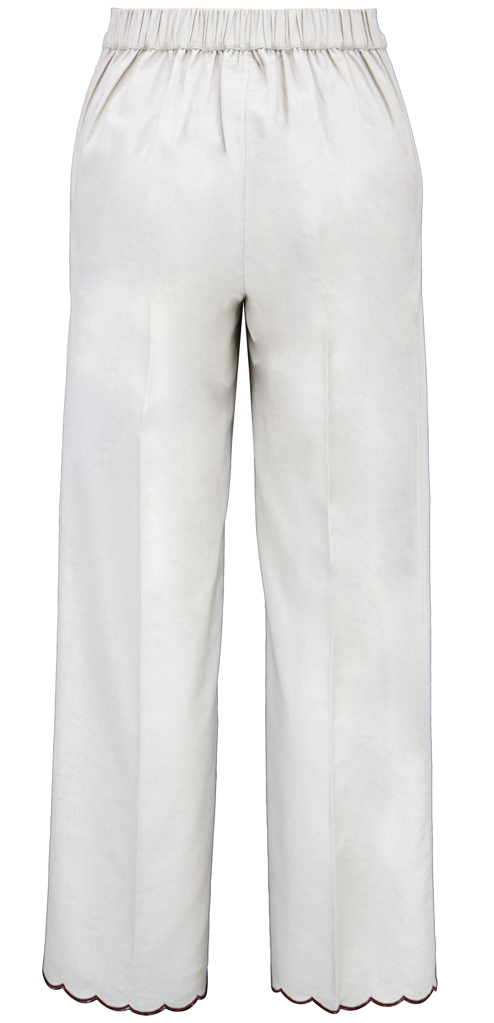 The Bondi Trousers are a relaxed yet refined summer essential, designed for effortless, sun-soaked styling. Crafted in lightweight cotton linen, they feature delicate floral embroidery along the front and a beautifully scalloped hem that adds a playful, artisanal touch. A flat front waistband keeps the look clean and polished, while the elasticated back ensures comfort and ease throughout the day. Unlined and airy with functional side pockets, these trousers are perfect for warm-weather dressing.