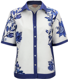 Breezy and effortless, the Cancun Shirt is designed for laid-back days with a touch of polish. Featuring a charming blue floral print, this oversized shirt is crafted in a cotton–modal fabric that feels fluid yet holds just enough structure for a clean silhouette. Delicate shell buttons add an elegant finish, while the relaxed fit makes it perfect for easy, sun-soaked styling. Wear it with the buttons left open over a tank, pair it with the matching Cancun Shorts, or style it with white trousers for a fresh resort-ready look.