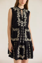 A Calling June favorite, the Hazel Mini Dress is a bestselling silhouette crafted in black cotton-linen with all-over floral embroidery and delicate tassel-tie details—equal parts refined and effortless.