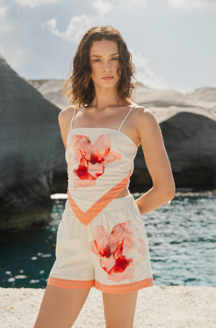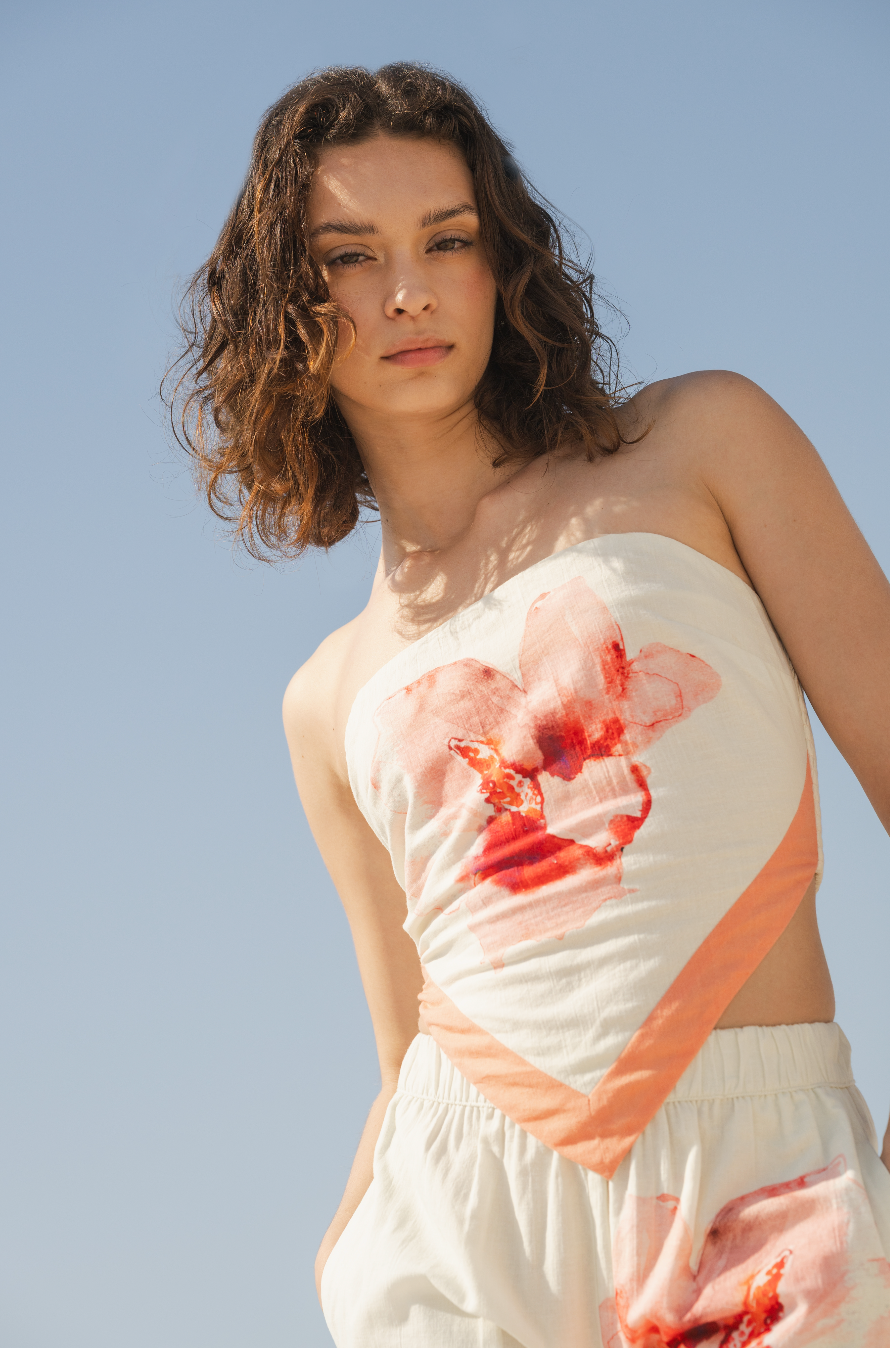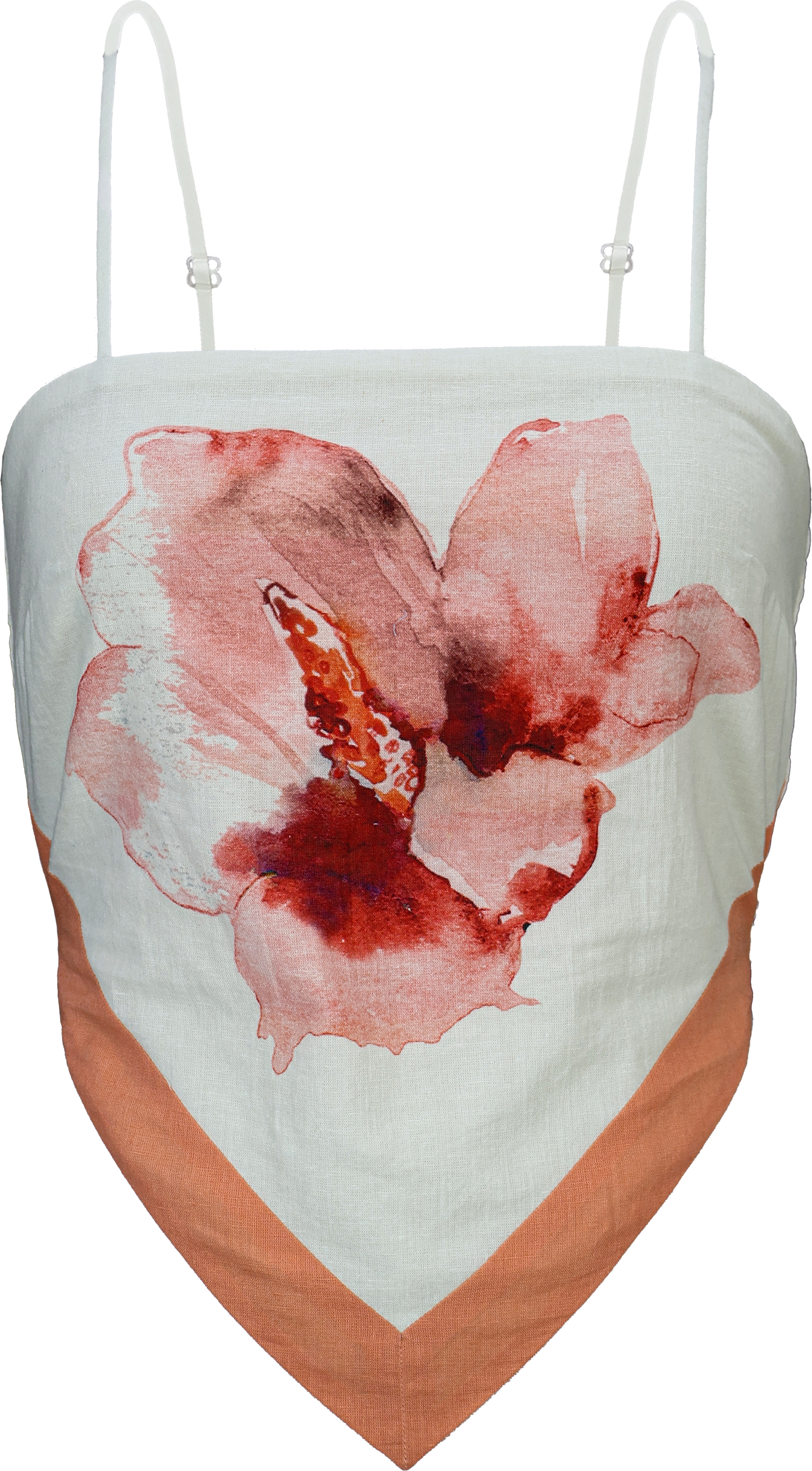 The Roma Top is a scarf-inspired statement blouse designed for effortless summer styling. Crafted in lightweight cotton linen, it features a unique floral Orianna print with a coordinated color border along the hem for a refined, elevated finish. Thin adjustable straps and a smocked back ensure a comfortable, flattering fit, while the versatile straps can be worn as functional shoulder straps or tucked in for a cleaner, strapless-inspired look.